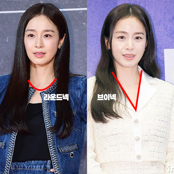 어떤가요? 단순히 네크라인 하나만 바꿨을 뿐인데, 김태희 님의 얼굴이 훨씬 매력적으로 빛나 보이지 않나요?