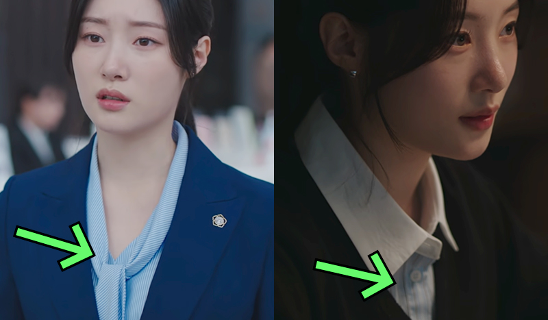 또 다른 장면에서는 리본 타이 블라우스를 착용한 모습도 볼 수 있어요.
