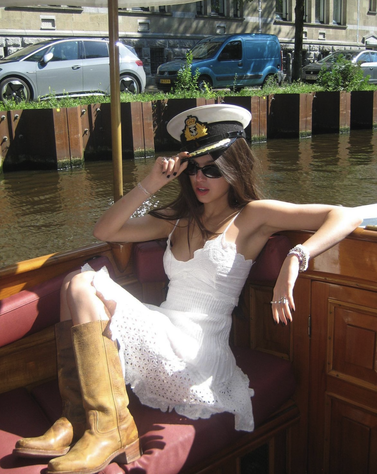 데일리룩으로 입고 싶다면 이 분을 주목해 보세요. Z세대를 대표하는 팝 아이콘 올리비아 로드리고를 아시나요? 그녀는 사랑스러운 레이스와 펀칭 디테일이 들어간 슬립 화이트 원피스를 입고 카멜 색상 부츠를 신었습니다. 여기에 실버 주얼리까지 착용하니 사랑스러운 무드를 한층 업그레이드 시켜줍니다. 여성스러운 원피스에 투박한 가죽 부츠를 착용하니 훨씬 감각적으로 보입니다. 여기서 팁은 보헤미안 무드를 추가하고 싶다면 와이드한 벨트를 함께 착용해 보세요.