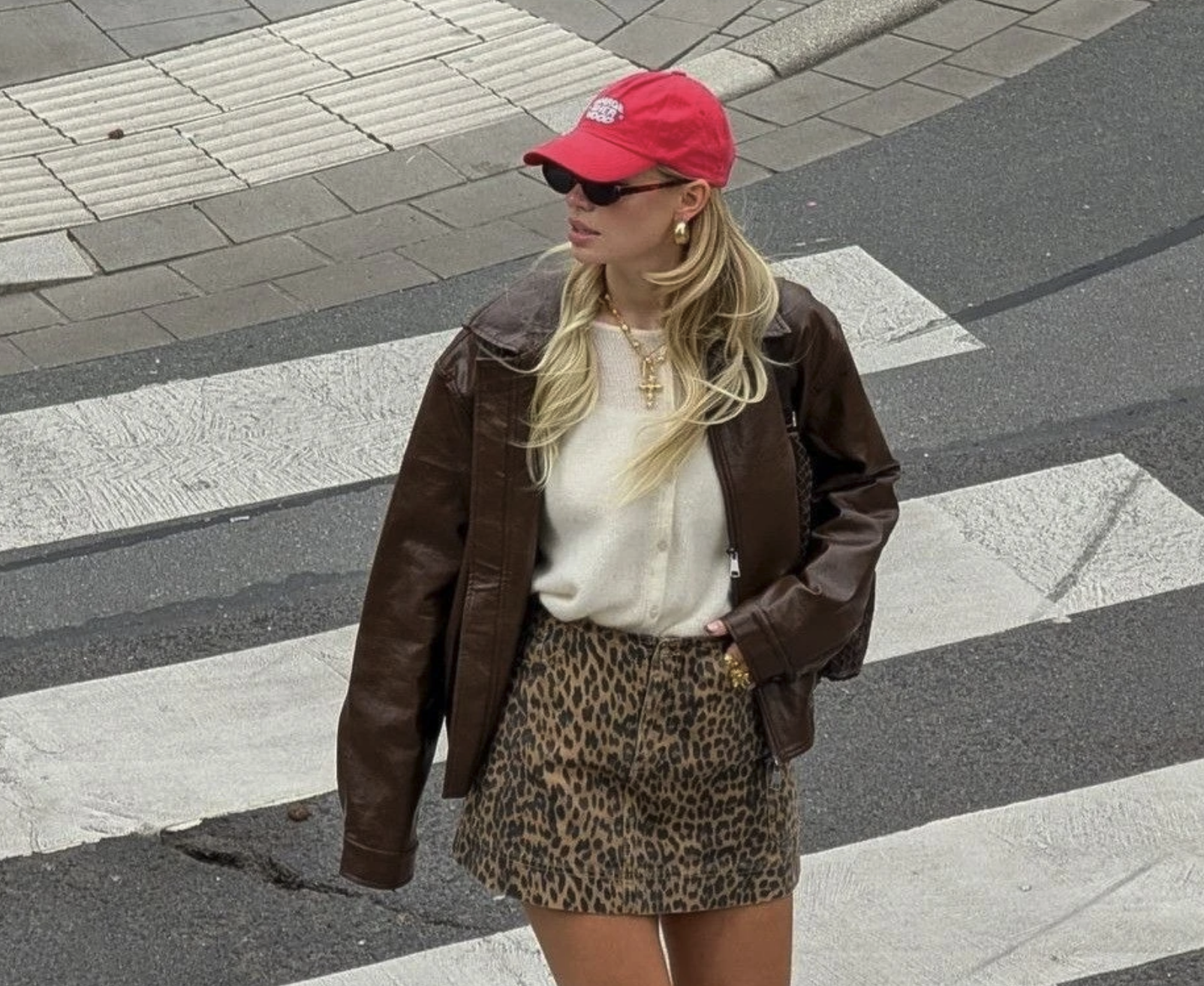 가을에 빠질 수 없는 브라운 가죽 재킷에 레드 카디건을 어깨에 둘러준다면?