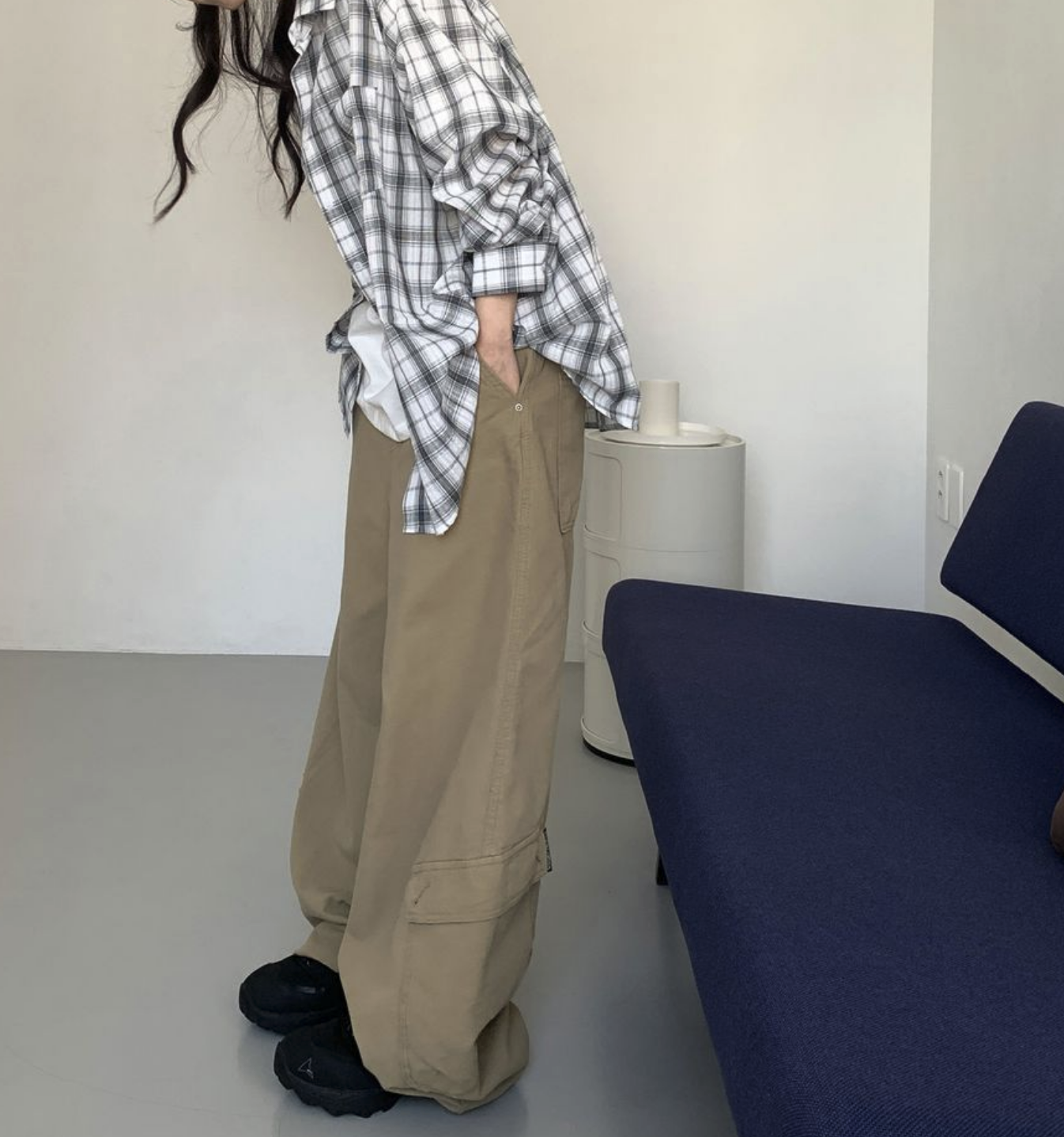 실용적인 포켓 디테일 덕분에 활동성도 좋고, 오버핏 체크셔츠와 함께 입으면