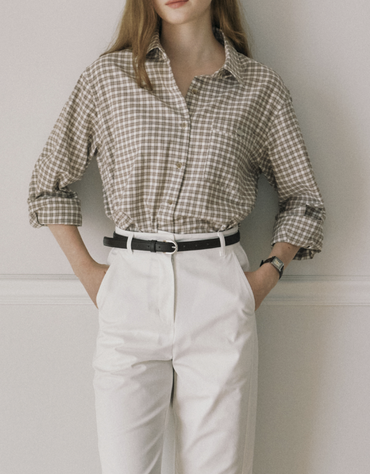 화이트 팬츠에 체크셔츠를 매치하면 깔끔하고 멋스러워요.