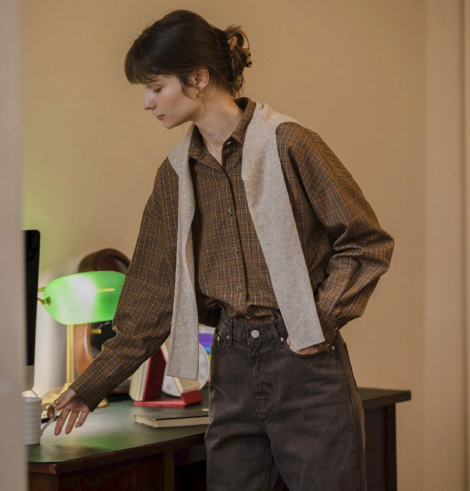 또 다른 방법으로는, 체크셔츠 위에 얇은 가을 니트어깨에 걸쳐 연출하는 거예요.